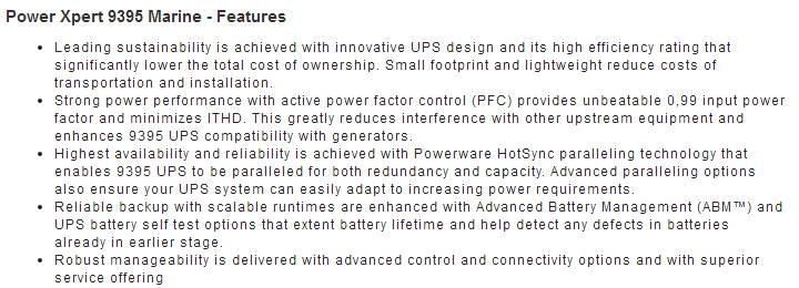 Formerly Eaton 9395 Marine Double-conversion online technology with power ratings 225-1100kVA, three-phase input and output, small foot print, patented Hot Sync parallel capability up to five redundant systems, ABM technology to extend battery service life, wide communication options.