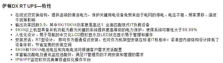 伊頓DX RT UPS可為關(guān)鍵服務(wù)器和網(wǎng)絡(luò)傳輸設(shè)備、IT機(jī)柜、電信通訊、VoIP等設(shè)備、銀行及安全系統(tǒng)、醫(yī)療系統(tǒng)、制造/控制系統(tǒng)、實(shí)驗(yàn)室設(shè)備、精密儀器儀表等提供安全可靠的電力保護(hù)。Eaton DX RT的輸出功率因數(shù)高達(dá)0.9,可提供更強(qiáng)大的帶載能力, 與目前已普遍使用了輸入功率因數(shù)校正電路的現(xiàn)代型計(jì)算機(jī)設(shè)備相匹配,且輸入諧波小,綠色環(huán)保